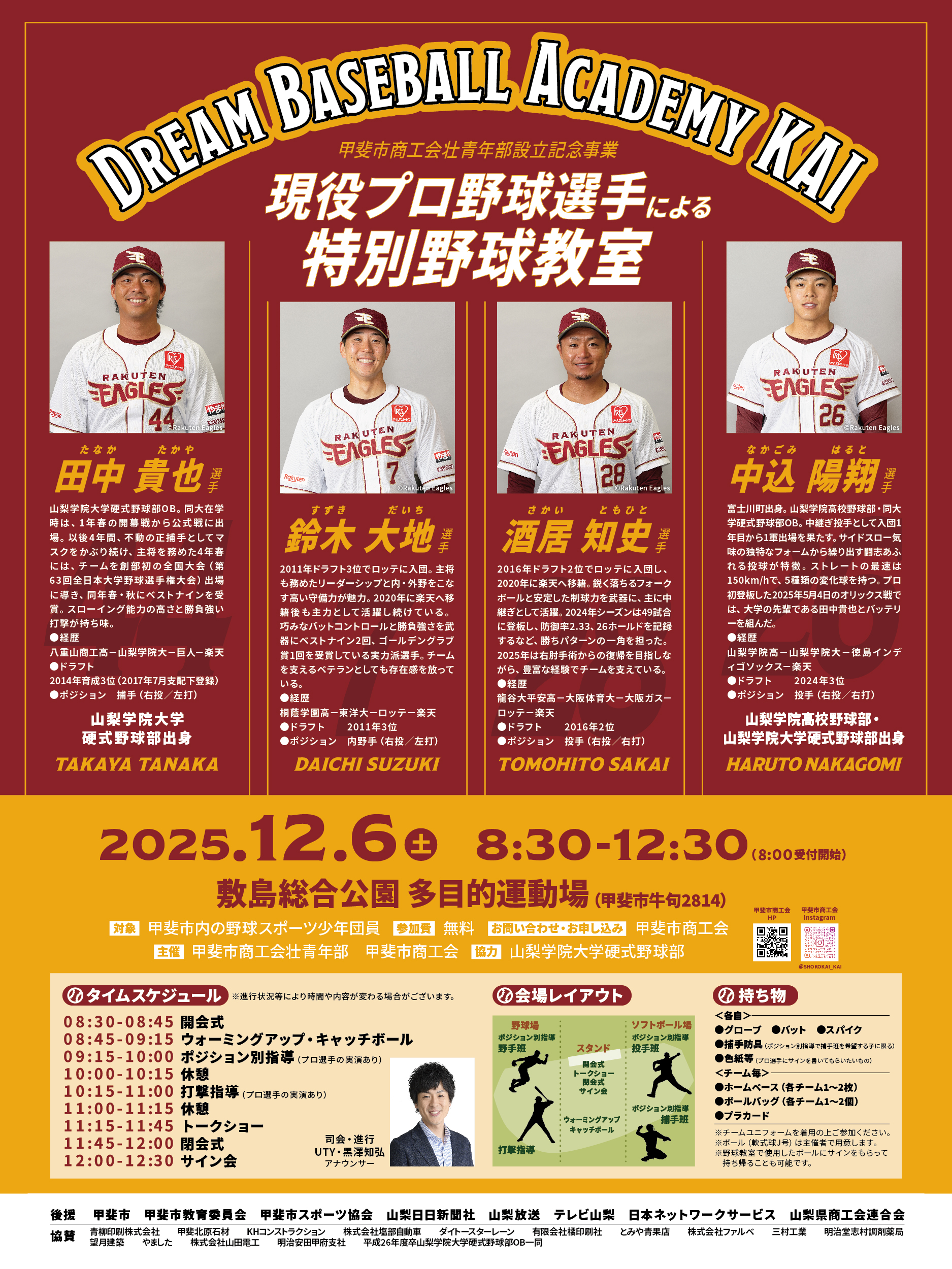 甲斐市商工会の内部組織で、本年3月に設立した壮青年部では、設立記念事業として、青少年の健全な育成や甲斐市及び地域スポーツの振興等を目的に、プロ野球・東北楽天ゴールデンイーグルスの現役選手による特別野球教室を実施いたします。